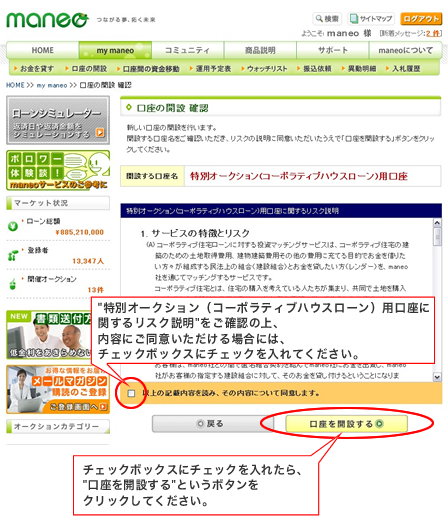 (A) コーポラティブハウスローンに対する投資マッチングサービスは、コーポラティブ住宅の建築のための土地取得費用、建物建築費用その他の費用に充てる目的でお金を借りたい方々が組成する民法上の組合(建設組合)とお金を貸したい方(レンダー)を、maneo社を通じてマッチングするサービスです。 コーポラティブ住宅とは、住宅の購入を考えている人たちが集まり、共同で土地を購入し、自分たちで設計と工事を発注し、住む側の要望に沿って作られる住宅 のことをいいます。これらの住宅購入希望者は、民法上の組合を組成し、一定の規約の下に意思決定を行ったり、一括して金銭を管理したりします。 コーポラティブハウスローンは、maneo社が、コーポラティブ住宅の建築をしたいと考えている建設組合に対して、その建築のための土地取得費用、建物建築費用その他の費用に充てるためのお金を貸し付けて、これを支援するものです。 お客様は、maneo社との間で匿名組合契約を結んでmaneo社にお金を出資し、maneo社がお客様の指定する建設組合に対して、そのお金を貸し付けるということになります。 このように、お客様は、maneo社にお金を出資していただくことによってレンダーとなり、建設組合に対してお金を貸し付けるのと同様の経済的効果を得ることになります(ただし、お客様は建設組合に対して直接お金を貸し付けるわけではなく、maneo社が建設組合に対して貸し付ける原資となるお金を出資することになりますので、直接お金を貸し付けるのと異なる点がいくつかあります。)
