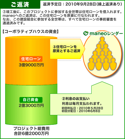 - (c) 建設組合の組合員は、金融機関による住宅ローンの事前審査通過者により構成されており、maneo社からの借入金元本は、弁済期日に、コーポラティブ住宅が竣工した際に各組合員が受ける当該住宅ローンにより一括返済を行います。