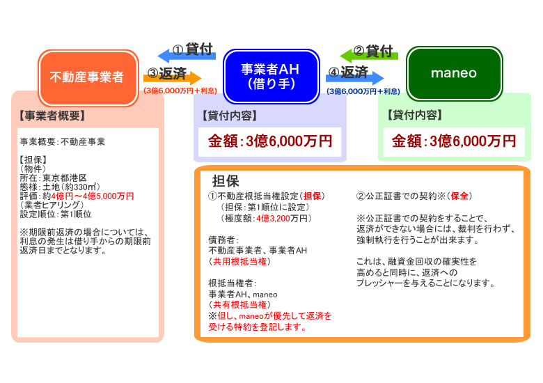 事業者AHと不動産事業者を債務者とし、maneo社と事業者AHを