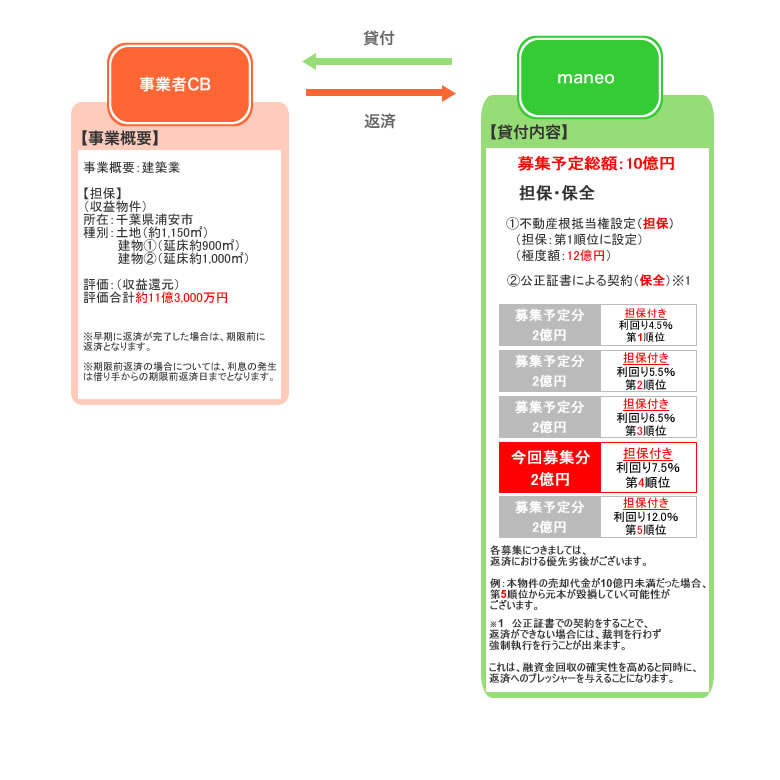 今回maneoでは、事業者CBに対する融資金として、2億円※1を