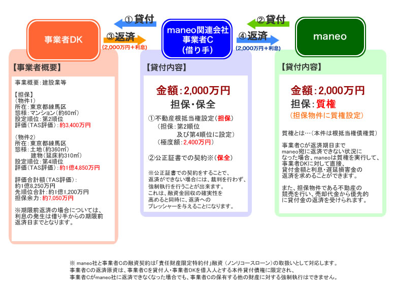 なお、maneo社と事業者Cの融資契約は「責任財産限定特約付」融資 (ノンリコースローン)