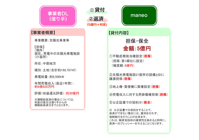 ・事業者DL所有の売電稼働中太陽光発電所21箇所に対する設備とIDの譲渡担保