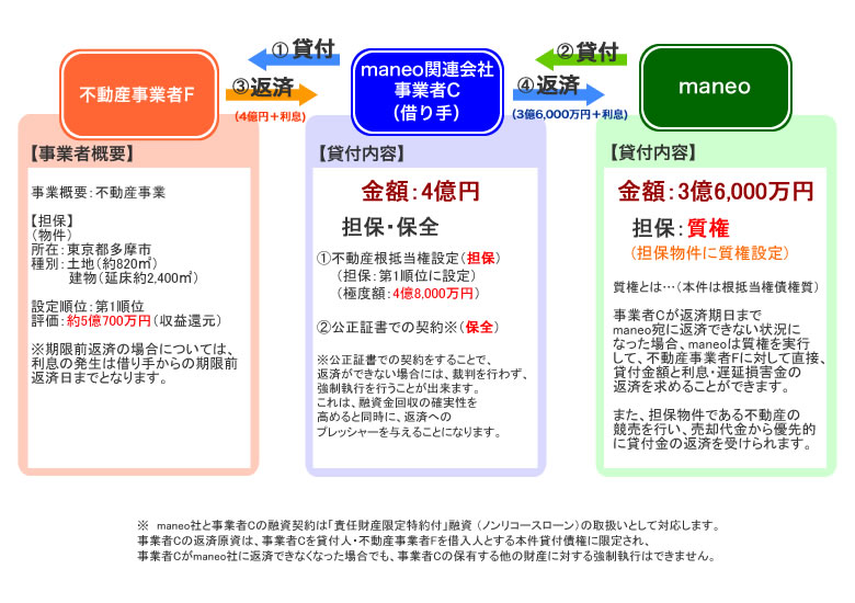 なお、maneo社と事業者Cの融資契約は「責任財産限定特約付」融資 (ノンリコースローン)