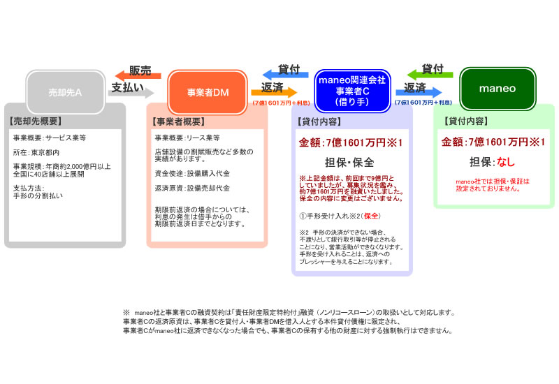 なお、maneo社と事業者Cの融資契約は「責任財産限定特約付」融資(ノンリコースローン)