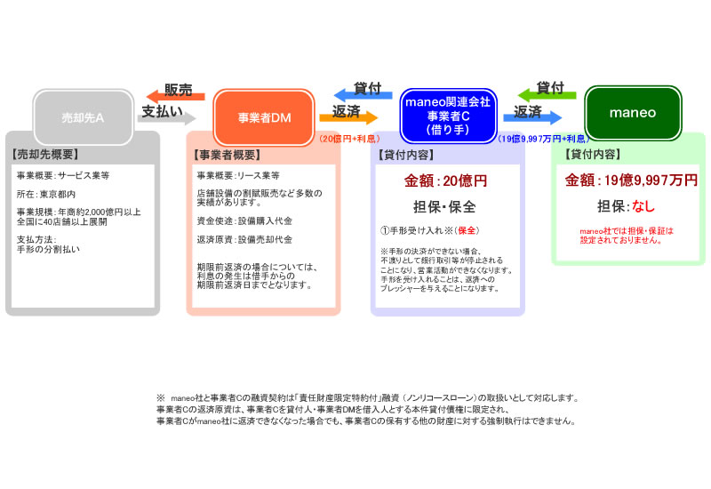なお、maneo社と事業者Cの融資契約は「責任財産限定特約付」融資(ノンリコースローン)