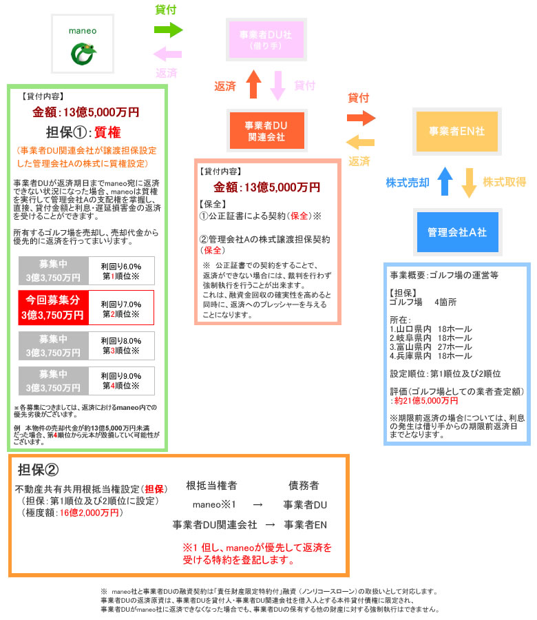 maneoでは、事業者DUに対する融資金として13億5,000万円を