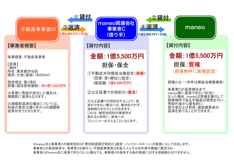 なお、maneo社と事業者Cの融資契約は「責任財産限定特約付」融資 (ノンリコースローン)