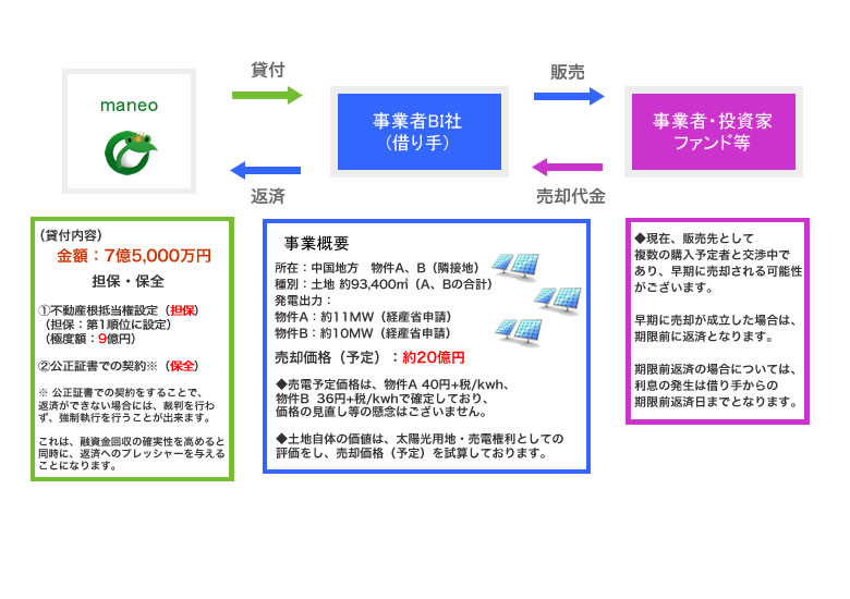 今般は、太陽光発電に必要な土地と権利を保有する事業者BIへの融資です。