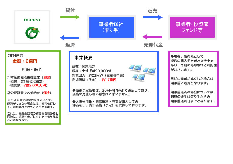 今般は、太陽光発電に必要な土地と権利を保有する事業者BIへの融資です。